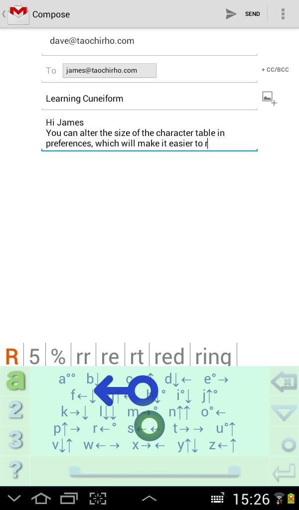 Toque y deslice. Cuneiform es un sistema de escritura revolucionario para tabletas y teléfonos. Simplemente toque o deslice en cualquier lugar del teclado para hacer los personajes.